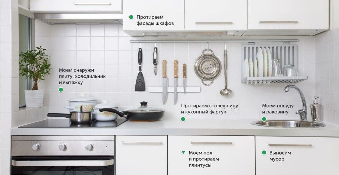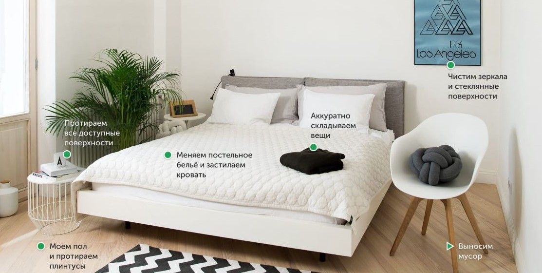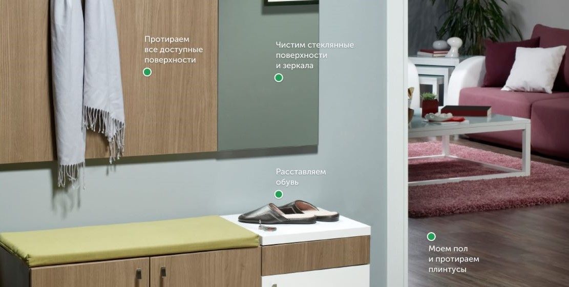 Помимо рутинных действий (вытирания пыли, мытья полов и т.д.) включает чистку труднодоступных мест: потолков, стен и других
